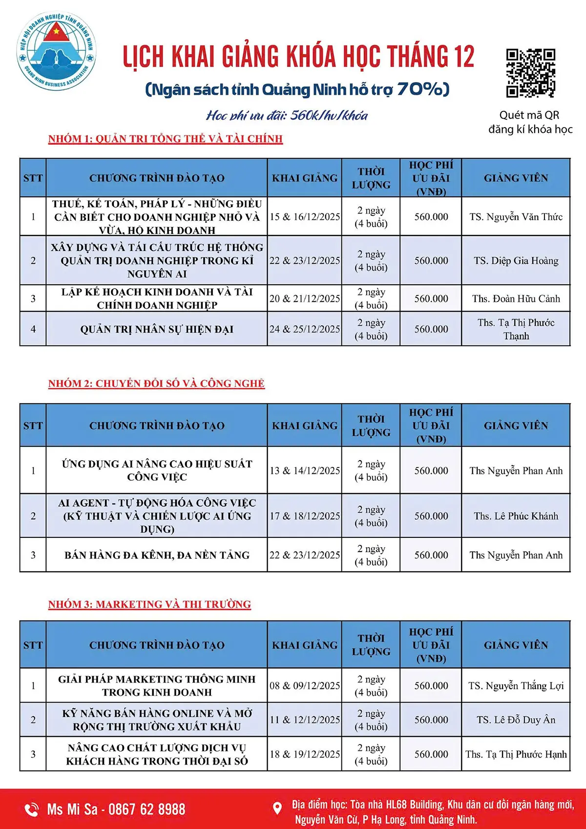 Trong tháng 12/2025, Hiệp hội Doanh nghiệp tỉnh Quảng Ninh chính thức triển khai chương trình đào tạo quy mô lớn gồm 10 khóa học chuyên sâu, hướng tới nâng cao năng lực quản trị và khả năng ứng dụng công nghệ cho khối doanh nghiệp nhỏ và vừa trên địa bàn. Đây là chương trình được ngân sách tỉnh hỗ trợ 70% học phí, mở ra cơ hội tiếp cận các khóa đào tạo chất lượng với chi phí ưu đãi chỉ hơn 500.000 đồng cho mỗi doanh nghiệp.